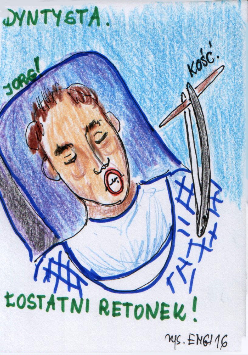 Somsiod uradowany, że niy bydzie musioł wiela czekać, rozparł sie na tym śmiysznym zeslu, co sie kopyrto a łotwarł gymba, ale dyntysta tam małoco widzioł, bezto kozoł chopu sjońć chustka, a łobrocił sie na bok, coby narychtować klyszcze. Jak już mioł wszystek pod rynkom, łokryncił sie nazod ku pacjyntowi a wrzasknoł tak głośno, że go było słychać aż we poczekalni, tak sie borok wylonkł, bo na stołku siedzioł jakiś zielony na pysku straszek!