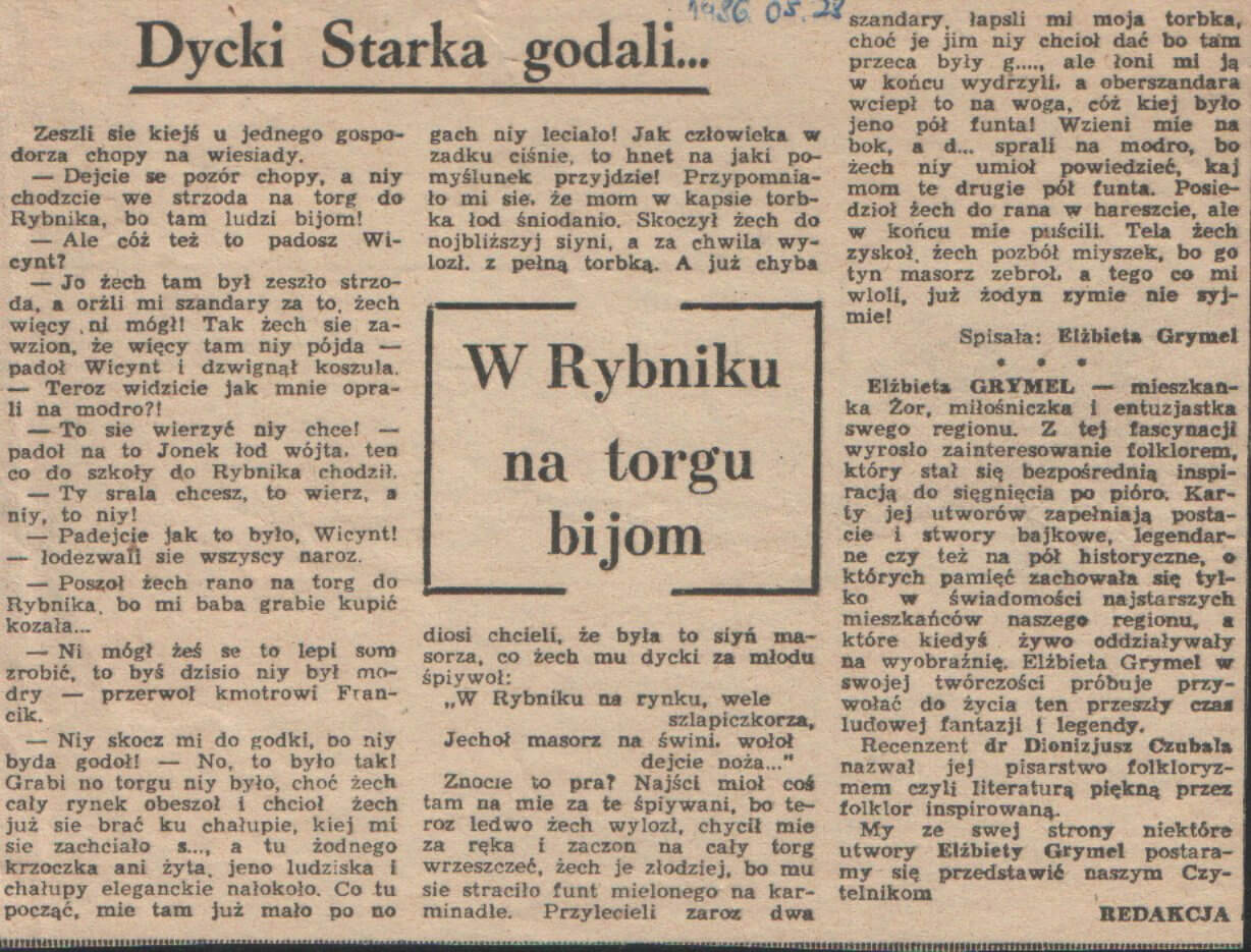 Jest to jedna z kilku opowieści dziejących się rzekomo w Rybniku. W roku 1986 została ona wydrukowana w „Nowinach”. Śpieszę wyjaśnić, że nie były to czasy dobre dla naszej śląskiej kultury. W tamtym czasie teksty w gwarze śląskiej drukowało tylko pisemko branżowe „Górnik” (teksty Hanika). Redaktor Naczelny Nowin, najpierw zdecydowanie odmówił mojej propozycji, potem jednak uległ mojej namowie, choć obawiał się, że poniesie za to konsekwencje. Był to pierwszy tekst w „Nowinach” napisany po śląsku. Został on dwukrotnie zapowiedziany i w związku z tym dowiedziało się o nim wiele osób. W dniu wydania przed kioskiem w Żorach na rynku ustawiła się kolejka, a sam artykuł był szeroko komentowano (osobiście to sprawdziłam!). Niesamowita satysfakcja dla osoby piszącej! Nie zepsuł tego fakt, że autorkę uznano za „chopa” , ponieważ „baby tak niy piszom”!.