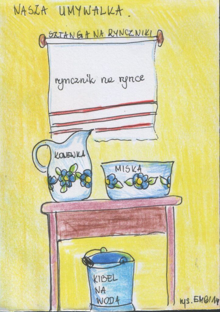Kole dźwiyrzy we naszyj kuchyni stoła drzewiano umywalka. Na ni dwie emaliowane miski, jedna do mycio gymby a rynkow, a drugo na nogi, trzecio starka miała skowano we kochtiszu na pomywani talyrzi a garcow. Pod umywalkom dycki stoły dwa kible ze czystom wodom a mało konewka. Wedle wisiały rynczniki łod cołki familiji. Pod ścianom stoł bifyj a zaroz za nim kochtisz, a nad nim wisiała romka ze gywyrcami. W samym rogu była kachlowo blacha, co na ni szło warzić a we rule piyc. Nad niom dycki schły zieliny na tyj. Naprzeciw dźwiyrzy wisioł krziż a pora świyntych łobrozkow. Pod nimi stoła leżanka. Jak kery przijechoł na odwiydziny, mogł się na ni przespać. Bliży łokna stoł stoł a szejść twardych stołkow a na ścianie wisiała wyszywano garnitura.